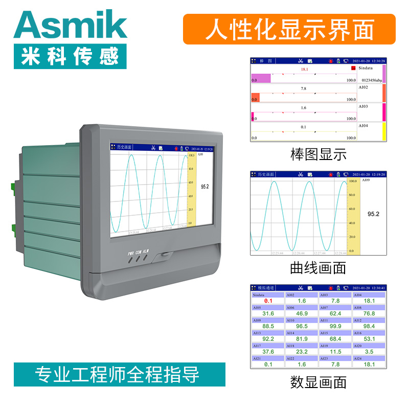 触摸式彩色无纸记录仪具有 60 个运算函数、24 路模拟量输入、3 路开关量输入、3 路脉冲量输入、6 路模拟量变送输出、16 路开关量输出,可实现运算、显示、记录、报警、分析统计报表、高速采样等功能,通过 RS-232/RS-485 和以太网通讯接口,可实现远程实时监控、组态管理、历史数据读取等功能,通过 U 盘可实现组态管理、监控画面管理和历史数据管理等功能。